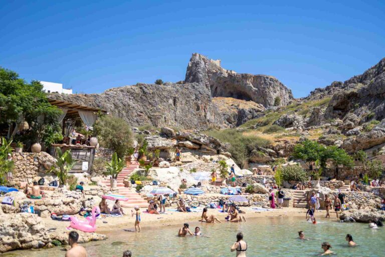 Explore the sandy beaches of Lindos! Choose between the intimate 'Pallas,' the bustling 'Megalos Yialos,' or the renowned St. Paul Bay